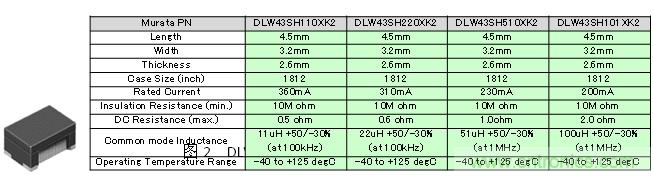 關于CAN中的噪聲對策產品,村田公司已經將對應的共模扼流圈DLW43SH系列產品化。該系列產品的外觀以及主要特征如圖2所示。DLW43SH系列是使用在CAN和FlexRay等車載LAN中的噪聲對策用共模扼流圈,是尺寸為4.5×3.2×2.6mm的表面貼裝品。特性值最大為100μH的共模電感,此外,DLW43SH的截止頻率約為1000MHz,可對應高速差分信號對高頻的要求。使用溫度范圍在-40~+125℃,因此適用于車載的廣泛應用。