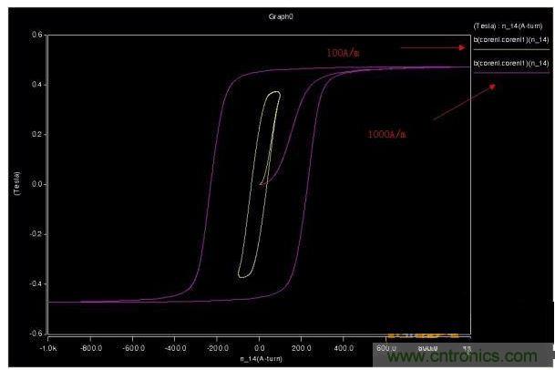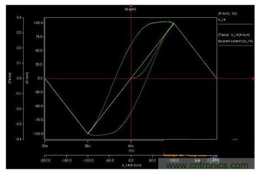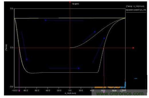 2、仿真CCM模式,磁滯回線上會出現兩個安匝跳變位置,但是磁通密度并不能跳變,而是通過下降來釋放能量。