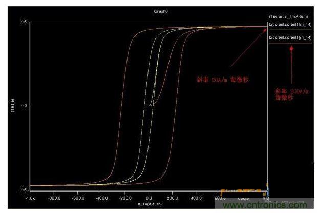 用三角波仿真了下磁芯,磁滯回線方正了很多,也不會因為正弦規律產生嚴重的拖尾效應。圖2是同頻率不同幅度。圖3同斜率不同幅度的。