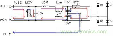 對ACL與ACN之間施加的浪涌電壓稱為差模浪涌電壓,差模路徑如圖中紅線所示;對ACL(或ACN)與PE之間施加的電壓稱為共模浪涌電壓,共模路徑如圖中藍線所示。