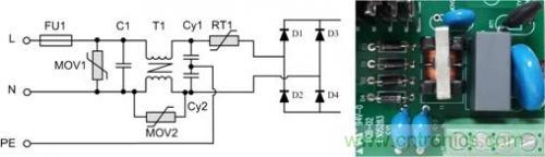 背景:以某型號的電源模塊為例,該模塊是周立功致遠電子為某客戶定制的電源模塊,輸入85VAC~350VAC,且EMC前級電路電路嵌入到模塊中??估擞恳蟛钅k妷?KV,共模電壓6KV。更換更大的保險絲后可承受6KV差模電壓。其前級原理圖及對應實物圖如圖2所示