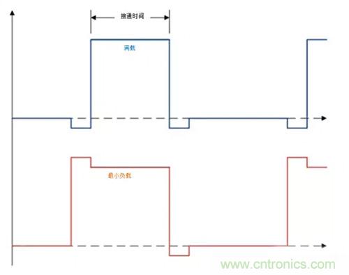 低到高的死區時間。當低側MOSFET關斷且高側MOSFET再次導通之前,通過電感器的電流對開關節點處的電壓進行充電,直到高側MOSFET的體二極管鉗位開關節點電壓。結果,死區時間的低側MOSFET關斷到高側MOSFET期間,開關節點為高。由于開關節點在該時間段為高,因此低到高的死區時間增加了有效最小脈沖寬度。在圖1中,您可看到,雖然導通時間相同,但脈沖寬度更大。