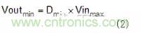 試圖在2MHz條件下工作時的第二個考慮因素是最小輸入電壓(VIN)和輸出電壓(VOUT)的轉換比。這與轉換器的最小接通時間有關,因為該比率在轉換器需要操作時設定接通時間。例如,若轉換器具有100ns的最小導通時間且在2MHz條件下工作,則使用公式1,其可以支持的最小轉換比(Dmin)為20%。若給定的VIN至VOUT比所需的導通時間小于最小導通時間,則多數轉換器進入脈沖跨越模式以保持輸出電壓穩定。當脈沖跨越時,開關頻率發生變化且可能在需要限制噪聲的頻率中引起噪聲。