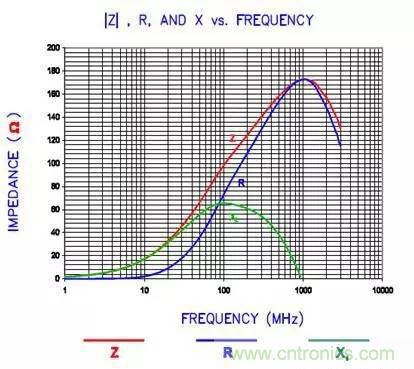 從等效電路中可以看到,當頻率低于fL(LC諧振頻率)時,磁珠呈現(xiàn)電感特性;當頻率等于fL時,磁珠是一個純電阻,此時磁珠的阻抗(impedance)最大;當頻率高于諧振頻率點fL時,磁珠則呈現(xiàn)電容特性。EMI選用磁珠的原則就是磁珠的阻抗在EMI噪聲頻率處最大。比如如果EMI噪聲的最大值在200MHz,那你選擇的時候就要看磁珠的特性曲線,其阻抗的最大值應該在200MHz左右。下圖是一個磁珠的實際的特性曲線圖。大家可以看到這個磁珠的峰值點出現(xiàn)在1GHz左右。在峰點時,阻抗(Z)曲線的值與電阻(R)的相等。也就是說這個磁珠在1GHz時,是個純電阻,而且阻抗值最大。