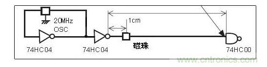 我們將兩個磁珠分別放在如下的20MHz的信號線上,看看對信號輸出會產(chǎn)生什么樣的影響。