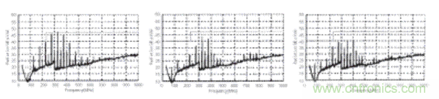 下面是上述三種情況對應的EMI測試結(jié)果。結(jié)果是磁珠A和磁珠B都會對EMI噪聲產(chǎn)生很大的衰減。磁珠A在整個EMI頻譜范圍內(nèi)的衰減要稍好于磁珠B。