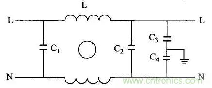 交流電源輸人線上存在以上兩種干擾,通常為低頻段差模干擾和高頻段共模干擾。在一般情況下差模干擾幅度小、頻率低、造成的干擾小;共模干擾幅度大、頻率高, 還可以通過導(dǎo)線產(chǎn)生輻射,造成的干擾較大。若在交流電源輸人端采用適當?shù)腅MI濾波器,則可有效地抑制電磁干擾。電源線EMI濾波器基本原理如圖1所示, 其中差模電容C1、C2用來短路差模干擾電流,而中間連線接地電容C3、C4則用來短路共模干擾電流。共模扼流圈是由兩股等粗并且按同方向繞制在一個磁芯 上的線圈組成。如果兩個線圈之間的磁藕合非常緊密,那么漏感就會很小,在電源線頻率范圍內(nèi)差模電抗將會變得很小;當負載電流流過共模扼流圈時,串聯(lián)在相線上的線圈所產(chǎn)生的磁力線和串聯(lián)在中線上線圈所產(chǎn)生的磁力線方向相反,它們在磁芯中相互抵消。 因此即使在大負載電流的情況下,磁芯也不會飽和。而對于共模干擾電流,兩個線圈產(chǎn)生的磁場是同方向的,會呈現(xiàn)較大電感,從而起到衰減共模干擾信號的作用。 這里共模扼流圈要采用導(dǎo)磁率高、頻率特性較佳的鐵氧體磁性材料。