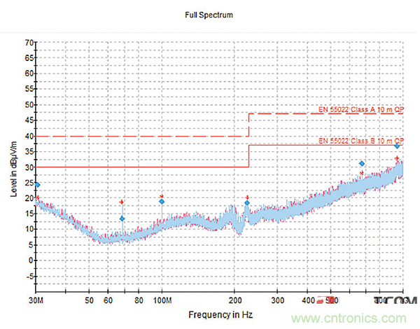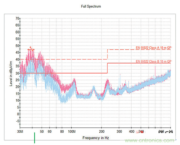 將圖7中的曲線圖看作是在沒有EMI濾波器的情況下測量的器件的噪聲輸出,這會導致出現代價昂貴的停產問題。值得注意的是,30MHz和70MHz之間的頻率超過了允許的限制,這意味著無論實際產品是否成功,設計都無法進入市場。盡管該設備具有屏蔽外殼,但該區域需要極其昂貴的重新設計或額外的濾波以將該噪聲降低到可接受的水平。