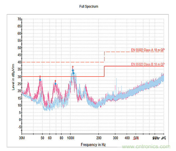 然后,使用22000pF芯片電容濾波器插件進行測試,試圖將最大濾波器性能調整到噪聲持續的較低頻率區域。如圖9所示,性能得到改善,在較低頻率的噪聲極限處或附近只有很小的尖峰。但是這個濾波器導致能量“膨脹”到105MHz附近的更高頻率,超過了允許的極限。