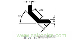與過孔相似,直角的轉(zhuǎn)彎路徑應(yīng)該被避免,因為它在內(nèi)部的邊緣能產(chǎn)生集中的電場。該場能耦合較強(qiáng)噪聲到相鄰路徑,因此,當(dāng)轉(zhuǎn)動路徑時全部的直角路徑應(yīng)該采用45度。圖5是45度路徑的一般規(guī)則。