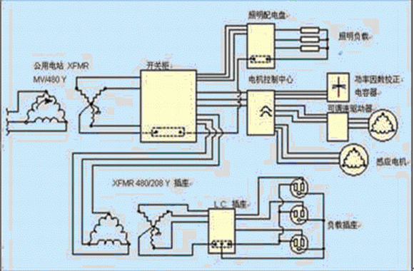 圖1 商業(yè)和工業(yè)設(shè)施中典型的簡化配電系統(tǒng)。
