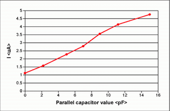 圖4. 晶體振蕩器電流與附加的并聯負載電容的關系
