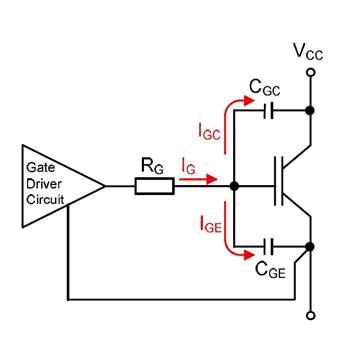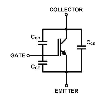 IGBT模塊的開關(guān)特性主要取決于半導(dǎo)體電容(電荷)及內(nèi)部和外部的電阻。圖1是IGBT電容的示意圖,其中CGE是柵極-發(fā)射極電容、CCE是集電極-發(fā)射極電容、CGC是柵極-集電極電容(或稱為米勒電容)。