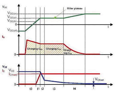 正如IG=f(t)圖所示,導(dǎo)通過程可以分為三個(gè)階段。分別是柵極-發(fā)射極電容的充電,柵極-集電極電容的充電和柵極-發(fā)射極電容的充電直至IGBT全飽和。柵極電流IG對(duì)輸入電容進(jìn)行充電,IGBT的導(dǎo)通和關(guān)斷特性由與充電過程有關(guān)的電壓VGE和VCE來(lái)體現(xiàn)。在關(guān)斷期間,所描述的過程運(yùn)行在相反的方向,電荷必須從柵極上移除。