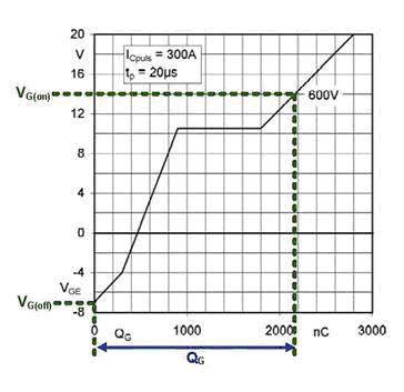 柵極電荷可以通過一個(gè)簡(jiǎn)化的測(cè)試電路進(jìn)行測(cè)量。當(dāng)柵極電壓VGE用示波器進(jìn)行測(cè)量時(shí),柵極由一個(gè)恒流源(QG=I*t)驅(qū)動(dòng)。所確定的柵極電荷曲線(圖3)可被用來(lái)計(jì)算驅(qū)動(dòng)IGBT所需的每脈沖柵極電荷。