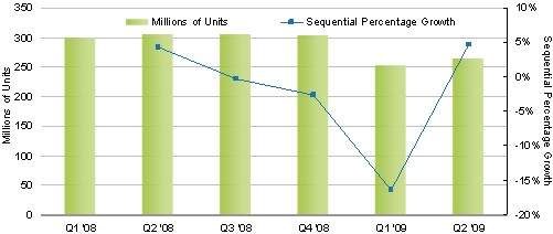 據iSuppli公司,第二季度全球手機出貨量比第一季度增長4.7%,這是自2008年第三季度以來首次出現環比增長。第二季度全球手機出貨量為2.65億部,而第一季度是2.53億部。