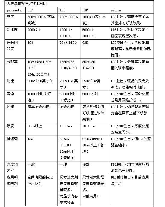 從以下對(duì)比表不難發(fā)現(xiàn),從技術(shù)層面來看,LCD技術(shù)占有綜合優(yōu)勢(shì)的地位,主要弱勢(shì)是拼接縫較寬,而DLP主要優(yōu)勢(shì)則在拼接縫最小,在色彩表現(xiàn)、分辨率、壽命等方面都有著較為明顯的缺陷。PDP則在防灼傷、分辨率方面相對(duì)較弱。