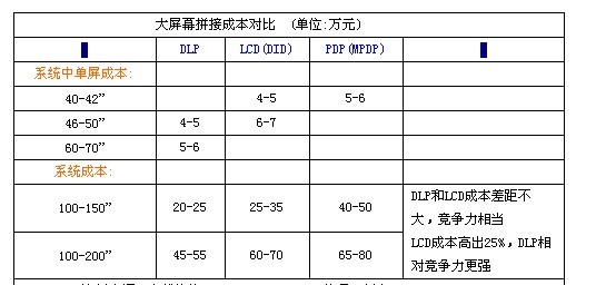 從總體系統(tǒng)分析,100-150”系統(tǒng)中,DLP平均成本為20~25萬元左右,而LCD和DLP的差距已經(jīng)縮小到10萬元以內(nèi),成本競(jìng)爭(zhēng)力基本相當(dāng)。在150”以上超大拼接系統(tǒng)中,LCD的成本要高出DLP大約25-30%,而MPDP更是要高出30%以上,這一領(lǐng)域DLP的成本競(jìng)爭(zhēng)力優(yōu)勢(shì)比較明顯。