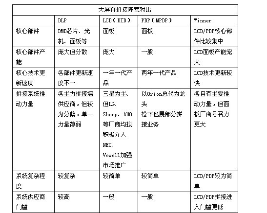 而LCD作為全球顯示產(chǎn)業(yè)中的王者,在競(jìng)爭(zhēng)中的整體力量無疑將更強(qiáng)一些,不過從未來2~3年的短期來看,LCD在大屏幕拼接市場(chǎng)的競(jìng)爭(zhēng)優(yōu)勢(shì)將主要體現(xiàn)在150”以下以及對(duì)拼接縫要求不太高的應(yīng)用領(lǐng)域(如教育、政府事業(yè)單位、公共場(chǎng)館、商業(yè)領(lǐng)域等),這一領(lǐng)域LCD有望在2~3年內(nèi)超過50%的比重;而在150”以上及對(duì)畫面整體效果要求更高的領(lǐng)域,則要等到50~70”級(jí)別面板成本大幅下降,以及拼接縫縮小到3mm以內(nèi),LCD才能真正獲得挑戰(zhàn)DLP地位的能力,而這一時(shí)間點(diǎn),我們判斷將出現(xiàn)在2012年。
