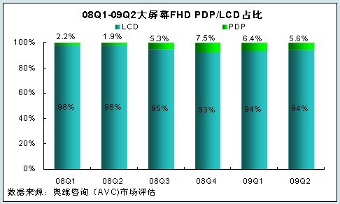 大屏幕等離子產(chǎn)品銷量的增加、全高清技術(shù)滲透率的提升,以及大屏幕全高清等離子產(chǎn)品價(jià)格的持續(xù)走低等助推了等離子在40英寸以上大屏幕FHD市場占有率由2008年上半年的2.0%,上升至2009年上半年的6.0%,同比增加4.0%。競爭力持續(xù)增強(qiáng)的趨勢已經(jīng)顯現(xiàn)。