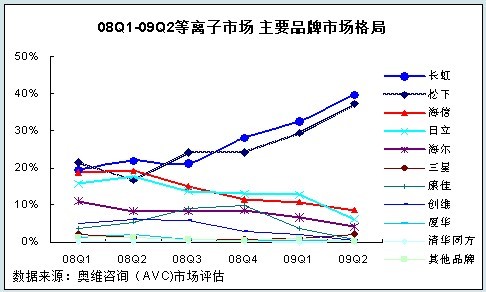 - 2009年上半年等離子市場長虹、松下市場占有率分別達(dá)35.4%、32.4%,二者合計(jì)達(dá)到67.8%