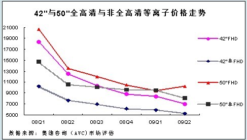 奧維咨詢(AVC)數(shù)據(jù)顯示:2009年上半年40英寸以上全高清等離子彩電在等離子整體市場占有率為24.6%,比去年同期增加了20.6%。大屏幕全高清等離子市場的高速增長,得益于其產(chǎn)品價(jià)格的下降和相對于非全高清產(chǎn)品的價(jià)格差距越來越小,替代不可避免。