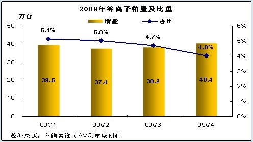 考慮到未來平板電視市場的走勢、結(jié)合等離子上下游產(chǎn)業(yè)情況,奧維咨詢(AVC)預(yù)測:2009年全年等離子銷量為155.4萬臺(tái),與2008年的總量基本持平。2009年下半年,受液晶市場的規(guī)模優(yōu)勢擠壓,第三、四季度等離子電視的銷量因彩電旺季到來將上升至78.6萬臺(tái),但占市場比重將下降至4.3%。