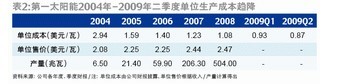第一太陽(yáng)能持續(xù)不衰的競(jìng)爭(zhēng)力主要來(lái)自不斷降低單位制造成本的能力。財(cái)務(wù)數(shù)據(jù)顯示,第一太陽(yáng)能的單位制造成本已經(jīng)從2004年的2.94美元/瓦壓縮至2008年的1.08美元/瓦。而在光伏產(chǎn)業(yè)掉頭向下的2008年四季度,第一太陽(yáng)能的平均生產(chǎn)成本降到了每瓦0.98美元,是全球首家生產(chǎn)成本低于每瓦1美元的太陽(yáng)能廠(chǎng)商。2009年其生產(chǎn)成本進(jìn)一步降低,一季度和二季度分別為0.93美元/瓦和0.87美元/瓦(表2)。第一太陽(yáng)能的總裁公開(kāi)表示,預(yù)計(jì)2014年其薄膜電池的生產(chǎn)成本可望降至0.52-0.63美元/瓦,且光電轉(zhuǎn)換效率由目前的10.9%提升至12.5%。