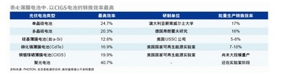 從成本來(lái)看,中投證券認(rèn)為,盡管晶體硅價(jià)格暴跌,CIGS仍具成本優(yōu)勢(shì)。首先,由于CIGS電池尚未達(dá)到量產(chǎn),通過(guò)成本細(xì)拆,參照工藝類(lèi)似的第一太陽(yáng)能的成本構(gòu)成(主要是設(shè)備折舊、玻璃、材料和人工等四項(xiàng)),在規(guī)?;?yīng)下,CIGS薄膜電池的成本約為1.07美元/瓦,已遠(yuǎn)低于目前的晶體硅電池成本。其次,CIGS電池采用相對(duì)廉價(jià)的玻璃為襯底,這樣所需的稀有元素耗損量大為減少;另外,CIGS電池的弱光效應(yīng)較好,對(duì)光照的要求降低,運(yùn)行時(shí)間遠(yuǎn)高于晶體硅電池。