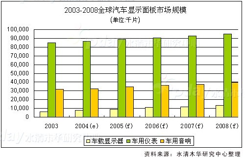 汽車信息系統的復雜性和信息密度在日益上升,這使得汽車內部顯示器不再僅僅是基本的集中儀表顯示,而是要滿足越來越詳細和多樣化的車內信息顯示需求。車載顯示器市場按應用分為車載導航裝置、車載電視,以及車載信息系統;按裝配時間分為原裝和后裝兩個市場。原裝市場需要經過嚴格的認證,進入較難;后配市場則不需認證,是目前最大的市場,約是原裝市場的20倍。未來隨著汽車導航系統等成為汽車標配,新車配備顯示器的比例即原裝市場的比例會逐步提升。