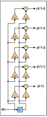 通過使用過采樣排列的數(shù)字濾波器,也可以實現(xiàn)這種卷積。圖中所示的排列是一個5點過采樣器。在這一排列中,每個新樣點都生成5個新樣點。濾波器輸出僅與新輸入和最后一個輸入有關(guān)。濾波系數(shù)通過對窗口采樣生成。