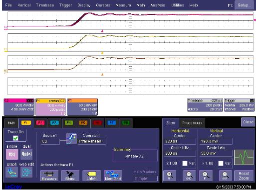 這張圖片說明了在WaveMaster示波器中怎樣測試SinX內(nèi)插的有效性。在這種情況下,它把重復(fù)的信號應(yīng)用到通道2,啟動余輝,使SinX內(nèi)插失效。F1定義為通道2的余輝曲線中間值。隨著時間推移,余輝曲線被填充,Ptrace中間值函數(shù)生成輸入模擬波形的清楚圖片。F1保存到存儲器M1中,成為參考曲線。