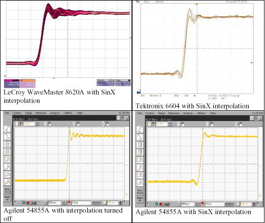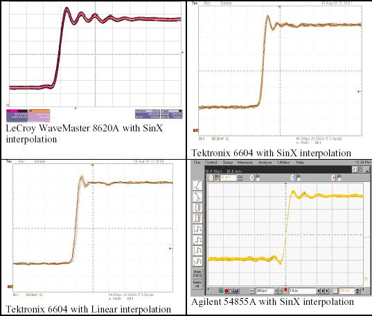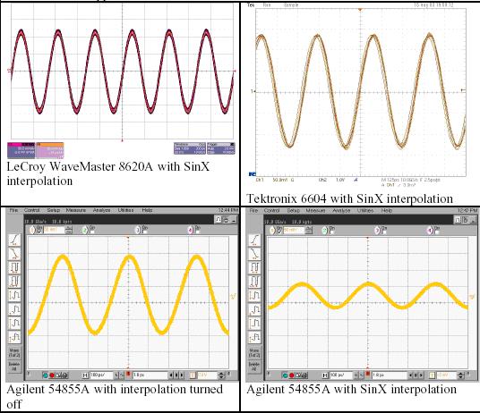 我們使用三種競爭的DSO進(jìn)行簡單的試驗,其分別是力科Wavemaster 8620A、泰克6604和安捷倫54855A。這三種示波器的帶寬指標(biāo)都是6 GHz,最大采樣率是20 GS/s。我們使用六種不同的信號和采樣率組合,說明SinX內(nèi)插算法的性能。