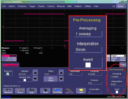 力科WaveMaster DSO體現(xiàn)了示波器用戶應(yīng)明確指定SinX內(nèi)插的原則,在默認(rèn)狀態(tài)下,SinX內(nèi)插是關(guān)閉的,在指定SinX內(nèi)插時,示波器會在實際樣點之間一直內(nèi)插9個額外的樣點,而不管其它示波器設(shè)置如何,如time/div。