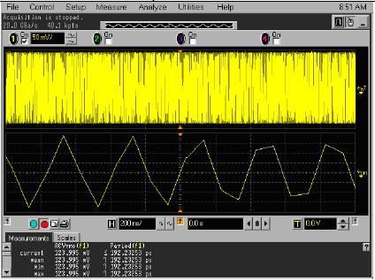 簡單地設(shè)置示波器,重復(fù)觸發(fā)波形,建立波形的余輝地圖,保證波形是重復(fù)的。在這一步時一定要關(guān)閉內(nèi)插。如果波形是重復(fù)的,它將建立一張很緊的余輝地圖。然后,在確定了重復(fù)性之后,您需要高效的采樣率,作為參考給出波形。大多數(shù)高端DSO提供了一種等效時間模式(力科示波器上稱為RIS),可以使用這種模式采集參考曲線。力科DSO還提供了一種處理函數(shù),稱為余輝曲線中間值,它從余輝地圖中提取中間波形。保存參考波形,以備以后比較。如果不能確定怎樣保存參考波形,可以打印余輝視圖,以進(jìn)行比較。