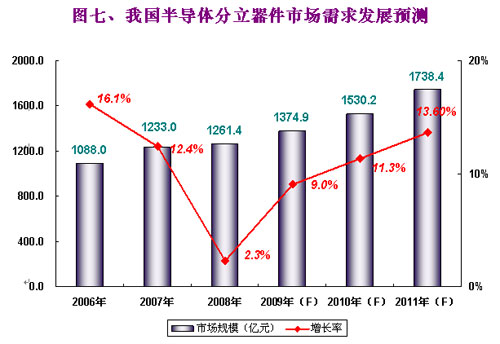 2008年我國分立器件產銷的一大亮點主要得益于全球電子整機對節能、環保需求的不斷增長,這一方面帶動了分立器件產品的需求增長,另一方面也帶動了市場產品結構的快速升級。銷售額在LED產業大幅增長的帶動下仍增長了12.3%,在二極管、三極管增速相對平穩之時,而以MOSFET和IGBT為主的功率晶體管的廣泛應用于PC、筆記本電腦、計算機電源配件、液晶電視等而得到提升。2008年我國分立器件產量達到2461.13億只,同比下降1.1%;2008年我國分立器件銷售額達到937.8億元,同比增長12.3%。(CSIA、CCID年度報告)