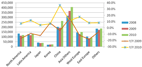 圖一 : 不同地區(qū)的手機(jī)出貨量與年成長(zhǎng)幅度
