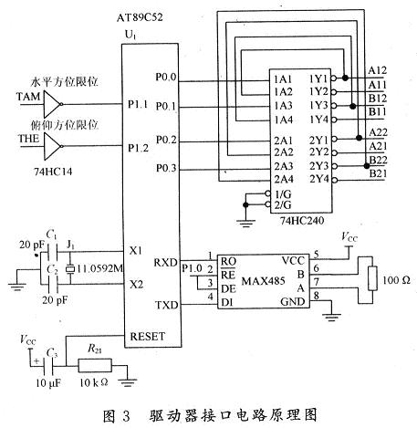 跟蹤系統中微處理器選用89系列性價比高和功耗低的89C52。74HC14芯片是6非門施密特觸發器,與P1.1和P1.2口相連,控制方位限位信號。74HC240芯片,八反相三態緩沖器/線驅動器,用于數據緩沖及總線驅動。系統使用兩片74HC240芯片,通過P0口引腳控制,兩片74HC240的16個輸出引腳作為步進電機驅動電路的輸入控制信號,分別控制步進電機俯仰方向和水平方位的正反轉。系統與上位機的通信選用MAX485接口芯片,由P1.0口控制其收發狀態。驅動器接口電路如圖3所示。