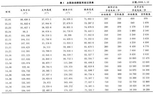 表1中列出了2009年1月12日中午至下午三時左右的理論數據,并用系統的手動校準功能,記錄下不同時刻的步進電機實際運行步數。