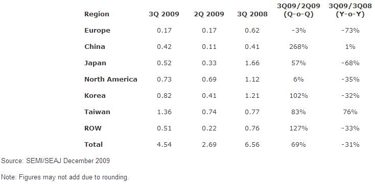 • 2009年第三季度全球半導(dǎo)體制造設(shè)備出貨額達(dá)到45.4億美元