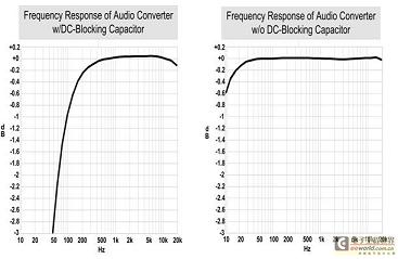 用來隔離DC電流的最常見技術是采用去耦電容,如圖1所示。在信號路徑中放置一個電容可以創建一個高通濾波器,其角頻率由耳機阻抗(R)和去耦電容(C)設置,等于1/(2πRC)。通常人的耳朵能夠聽到聲音頻率最低為20Hz。根據這個下限和耳機的典型阻抗,可很容易地計算出所需的電容值。對于20Hz的角頻率,電容容值取500uF。
