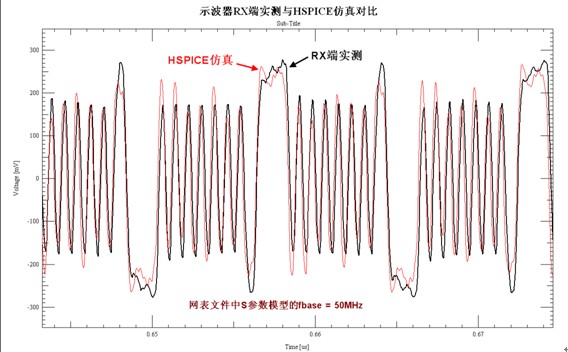 在圖9中分別為fbase=30/40/50MHz時,HSPICE仿真出的接收端波形。可以看到fbase=50MHz時,低頻的碼型(長1或長0)幅度較低些,與實測RX端波形的比較接近。在使用HSPICE仿真時,fbase=50MHz時的仿真時間遠小于最開始的頻率設置(fbase = 10MHz)。在圖10中,對比了fbase=50MHz時HSPICE仿真的RX端波形與實測波形,兩者一致性比較好。