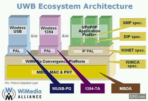 Wireless USB 1.0標準是在2005年5月12日正式發(fā)佈,它的實體層(PHY Layer)、媒控層(MAC Layer)是使用MBOA組織所訂立的超寬頻(UWB)技術(shù),在PHY層、MAC層之上再搭建一層WiMEDIA Alliance所訂立的聚合層(Convergence Layer,IEEE 802.15.3a),在聚合層之上再依據(jù)不同的無線傳輸應(yīng)用而訂立不同的協(xié)定因應(yīng)層(Protocol Adaptation Layer;PAL),最后才將WUSB的通信建立于最上端,如此使WUSB運作。(附註:MBOA(Multi-Band OFDM Alliance)于2005年3月與WiMEDIA Alliance合併。)