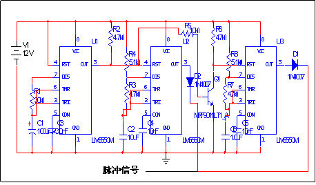 充電電路與脈沖信號結合,對電路進行充電。這里的脈沖信號可用555定時器來實現,用3個555來構成一個頻率在周期變化的脈沖信號。電路圖如圖。