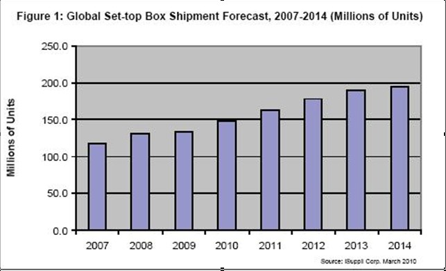 據(jù)iSuppli公司,機(jī)頂盒出貨量未來(lái)幾年將繼續(xù)增長(zhǎng)。消費(fèi)者收看模式發(fā)生轉(zhuǎn)變,通過(guò)互聯(lián)網(wǎng)提供的電視內(nèi)容越來(lái)越流行,從而將為提供商創(chuàng)造條件,在數(shù)字家庭的激烈爭(zhēng)奪中獲得新的營(yíng)業(yè)收入來(lái)源。