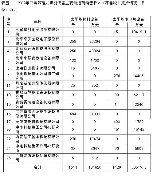 2009年下半年在光伏產業市場的推動下,我國晶硅太陽能設備得到迅速復蘇,2009年我國主要太陽能電池制造商太陽能設備銷售收入比2008年增長了14.44%,達到20.21億元。其中:太陽能級晶硅生長和加工設備增長7.34%,達到13.16億元,占太陽能電池設備銷售收入的65.1﹪(2008年為69.4%);晶硅太陽能電池芯片制造設備增長30.56%,達到7.05億元,占太陽能電池設備銷售收入的34.9﹪。