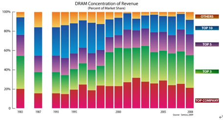 能夠看到的兼并主要集中在半導體的制造部分, 如在存儲器DRAM, 尤其是近10年來。從數據看DRAM供應商中, 前1, 前3及前5及前10位從進入新世紀以來它們的份額都在減少, 實際上近25年來它們己進行了多次兼并。從1983年計(公司剛開始有DRAM數據)DRAM的前1, 前3及前5的市場份額幾乎未變, 而依前10計, 比1983年時還稍少了一些。