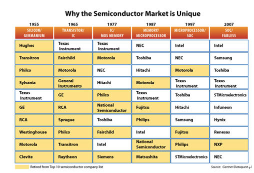 在半導體業中要實現領先地位, 保持增長, 爭得更大的市場份額依靠的是最先進技術的推動,但是只有少數公司能做到這一點。在1950年能進入前10, 意味著是鍺或硅晶體管的領導者。在1960年代, 能夠維持增長并領先是依靠雙極型集成電路技術, 在該10年中, 排在前10名中的公司有40%消失, 而到1970年代,其中的80%也消失了。在70年代時, 是依靠MOS存儲器來推動增長, 當時日本有三家公司,NEC,Hitachi及Toshiba進入前10。到1980及1990年代, 排在首位是依靠微處理器, 如英特爾與Motorola。在1990年代, 情況有所變化, SoC的領導者, 如STMicroelectronics及TI進入前10。而到最近10年中,fabless公司如Qualcomm及代工大亨TSMC進入前10中。