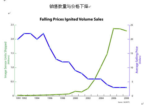 半導體在新應用中增加滲透最有趣的例子是隨著市場應用的銷售額增加,而芯片的價格卻不斷下降。如數碼相機,其中使用的半導體主要是非揮發存儲器,圖像傳感器 。在1990年代初期,固態圖像傳感器的售價為20-25美元,直到最近10年,圖像傳感器的總市場銷售額,仍是很小,幾乎可忽略不計。在2000年代圖像傳感器的價格己從20-25美元下降到5美元。在這價格范圍時,由于使用數量急速上升,使得在過去幾年中圖像傳感器的TAM達到半導體總銷售額的3%以上。在此同時,NAND閃存價格每年下降65%, 主要是市場需求數量成正比增加。其結果是數碼相機的銷售額及其使用的半導體持續的增長。