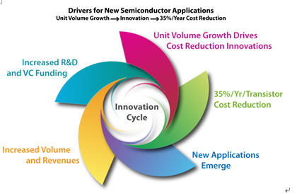 在如此高的累積數量增長下推動學習曲線的成本下降,在過去10年中每年晶體管的成本下降35%及總體上能使新的應用市場達到規模化。如2001年的MP3播放機的價格與今天的攝像機相同, 而今天攝像機中用的存儲器容量增長了10倍, 而且與2001年時的尺寸及功耗幾乎相同。